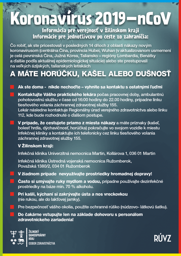 Úrad verejného zdravotníctva SR zriadil k otázkam verejnosti týkajúcich sa nového Koronavírusu Call centrum s nepretržitou prevádzkou, verejnosť môže odborníkov kontaktovať prostredníctvom e-mailovej adresy ako aj telefonicky. Bližšie informácie sú k dispozícii na: http://www.ruvzca.sk/oddelenia/epidemiologia/aktuality/koronavirus-2019-ncov